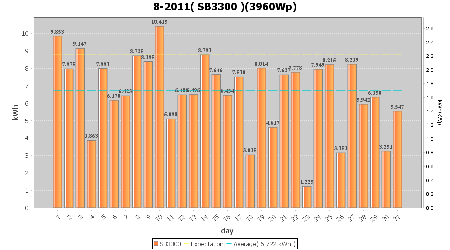 | 15-8-2011 | kWh | W/Wp | 7.646 | 3960 | 1.9 | 3.536 | $ 4.17 | 3.7 | |