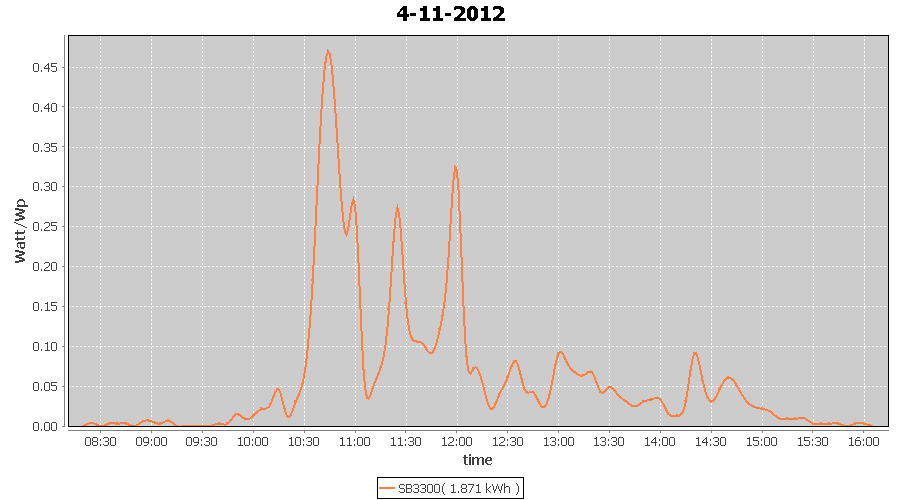 | 4-11-2012 | kWh | W/Wp | 1.871 | 3960 | 0.5 | 0.865 | $ 1.10 | 1.6 | |