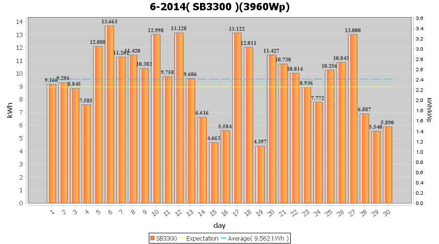 | 13-6-2014 | kWh | W/Wp | 9.606 | 3960 | 2.4 | 4.443 | $ 6.11 | 3.3 | |