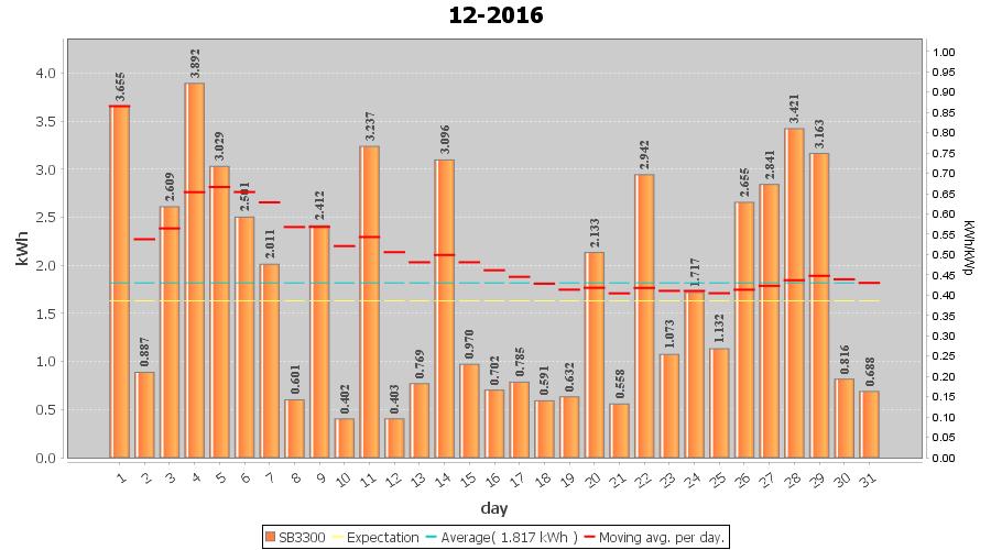 | 29-12-2016 | kWh | W/Wp | 3.163 | 3960 | 0.8 | 1.463 | £ 2.05 | 5.6 | |