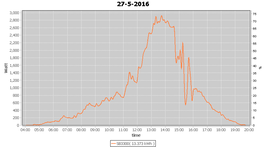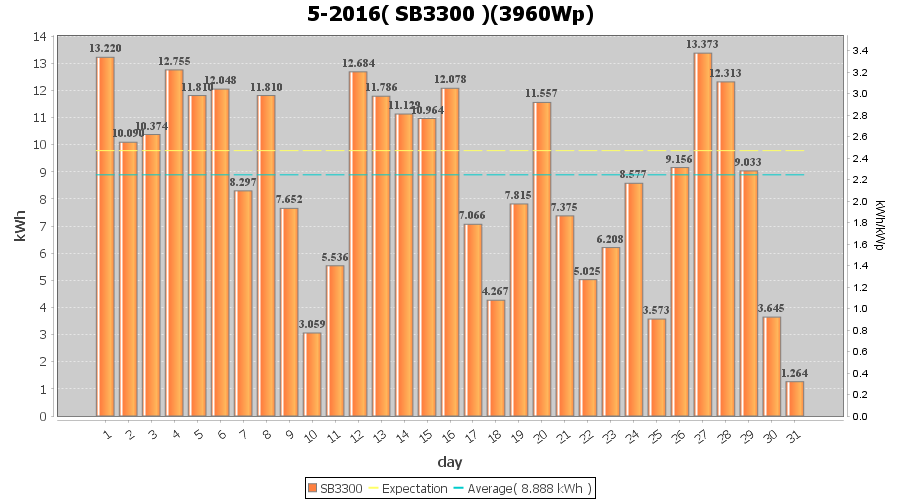 | 27-5-2016 | kWh | W/Wp | 13.373 | 3960 | 3.4 | 6.185 | £ 0.00 | 4.9 | |