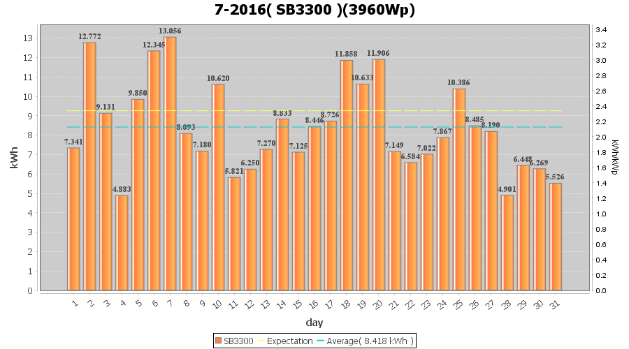 | 7-7-2016 | kWh | W/Wp | 13.056 | 3960 | 3.3 | 6.038 | £ 8.48 | 5.0 | |