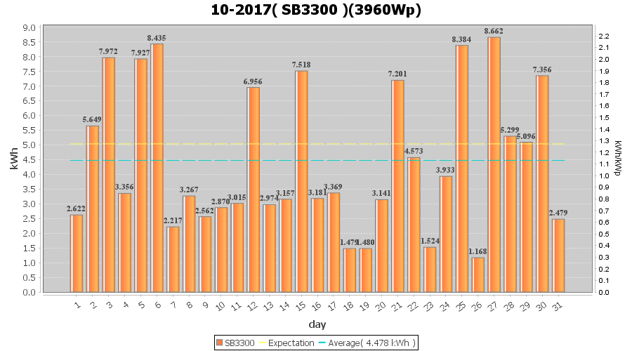 | 15-10-2017 | kWh | W/Wp | 7.518 | 3960 | 1.9 | 3.477 | £ 5.01 | 5.4 | |