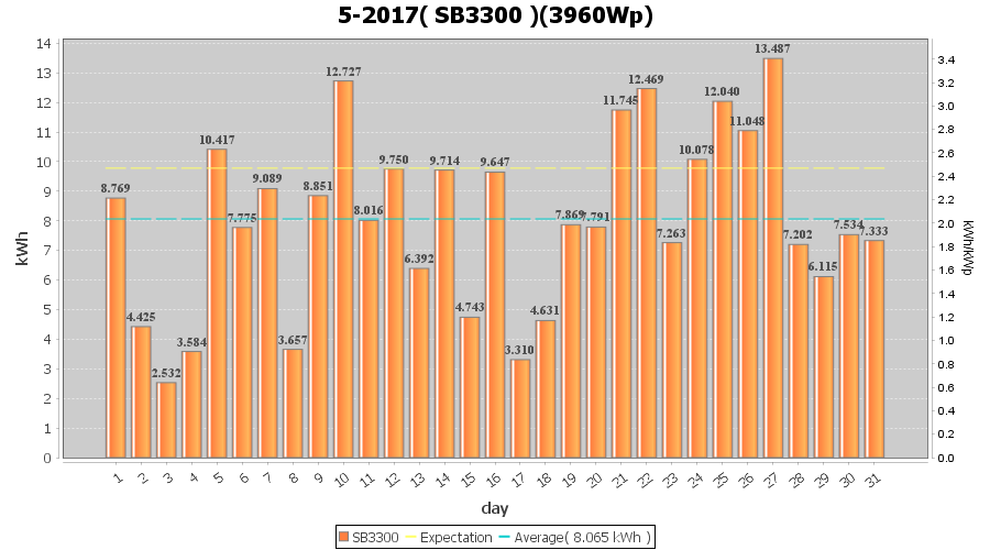 | 17-5-2017 | kWh | W/Wp | 3.310 | 3960 | 0.8 | 1.531 | £ 0.00 | 1.3 | |