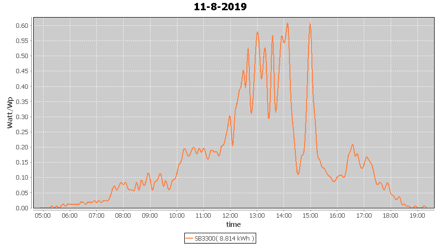 | 11-8-2019 | kWh | W/Wp | 8.814 | 3960 | 2.2 | 4.076 | £ 0.00 | 3.4 | |