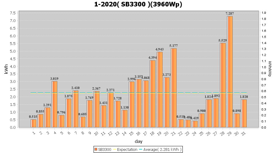 | 20-1-2020 | kWh | W/Wp | 3.273 | 3960 | 0.8 | 1.514 | £ 2.39 | 4.6 | |
