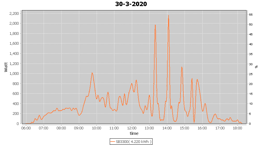 | 30-3-2020 | kWh | W/Wp | 4.220 | 3960 | 1.1 | 1.952 | £ 3.08 | 1.7 | |