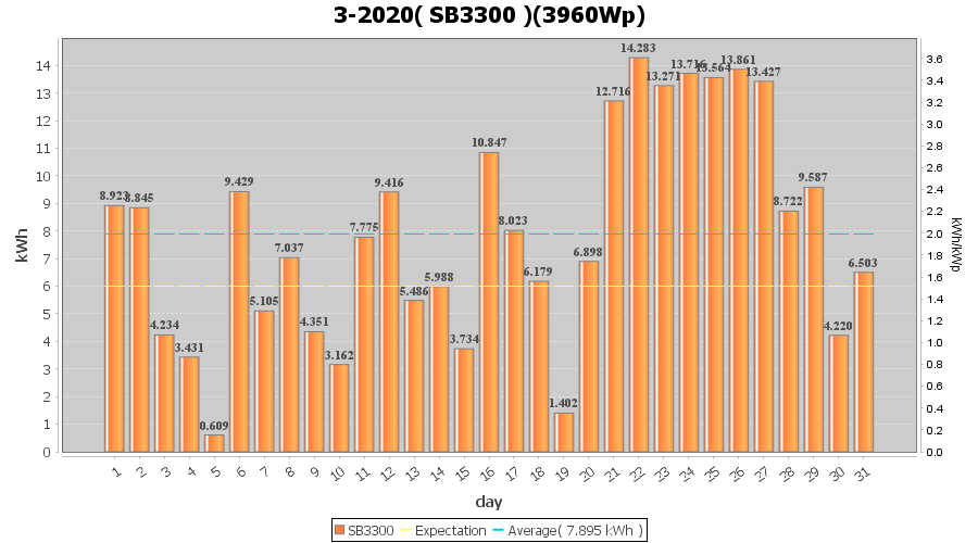 | 22-3-2020 | kWh | W/Wp | 14.283 | 3960 | 3.6 | 6.606 | £ 10.42 | 5.8 | |
