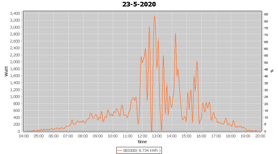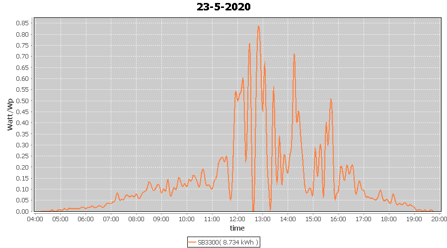 | 23-5-2020 | kWh | W/Wp | 8.734 | 3960 | 2.2 | 4.039 | £ 6.37 | 2.7 | |