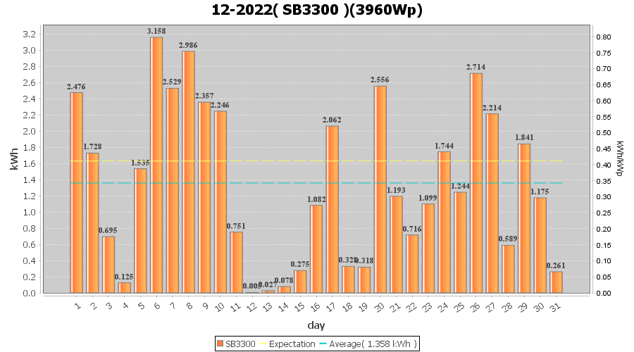 | 26-12-2022 | kWh | W/Wp | 2.714 | 3960 | 0.7 | 1.255 | £ 2.58 | 6.4 | |