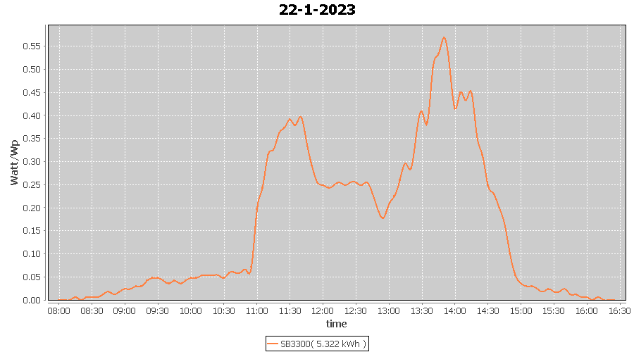 | 22-1-2023 | kWh | W/Wp | 5.322 | 3960 | 1.3 | 2.461 | £ 5.07 | 7.2 | |