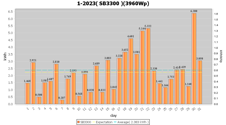 | 30-1-2023 | kWh | W/Wp | 6.380 | 3960 | 1.6 | 2.951 | £ 6.08 | 8.6 | |