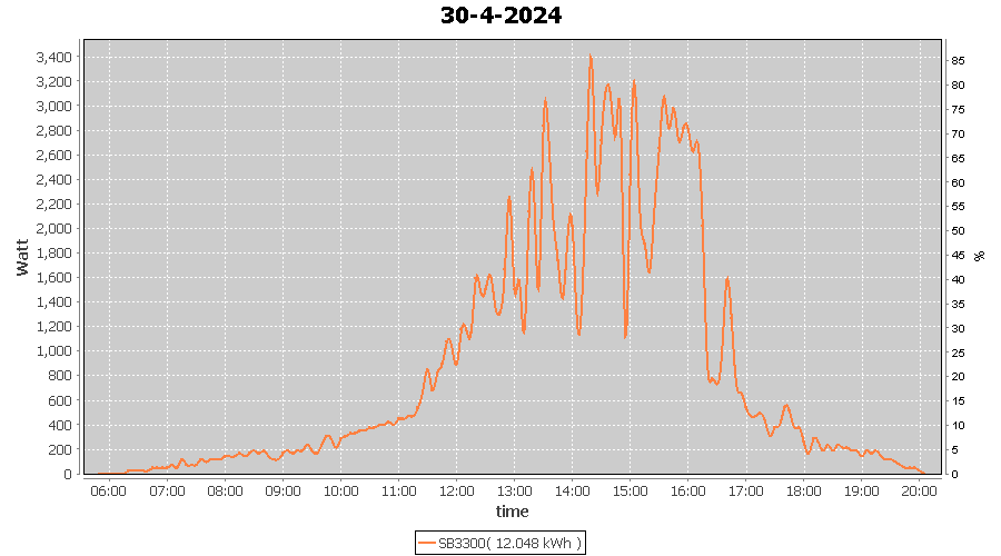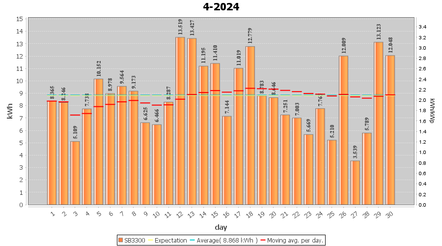 | 30-4-2024 | kWh | W/Wp | 12.048 | 3960 | 3.0 | 5.572 | £ 0.00 | 4.5 | |